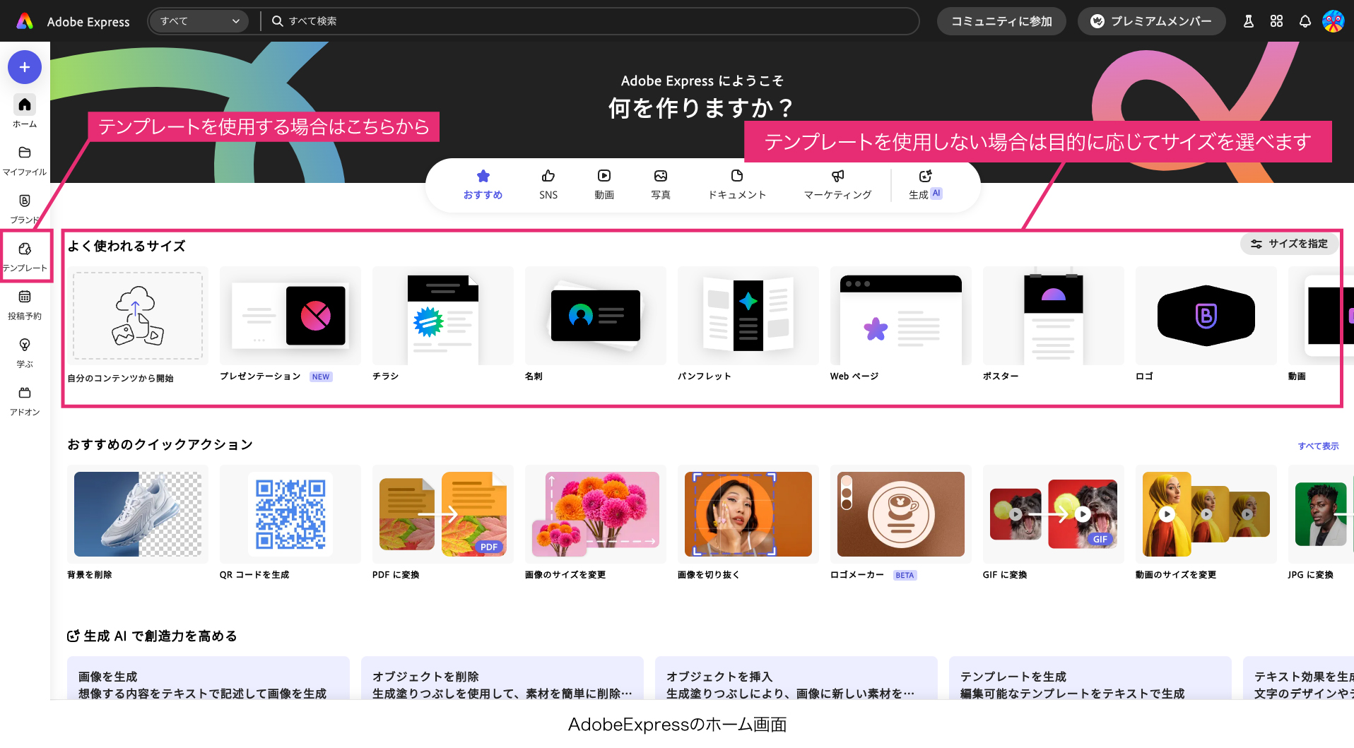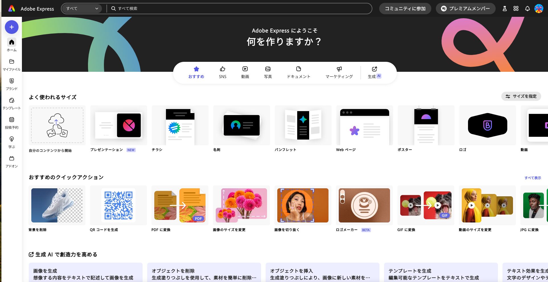 Adobe Expressは無料で使用できる ことも魅力の一つだと思います。無料プランでも基本的な機能やテンプレート、フォント、素材、AI生成機能を使用することができます。まずは無料プランで使用してみて、必要であればプレミアムプランにアップグレードすればいいので不必要な費用もかかりません。プレミアムプランでは更に多くのフォントや素材、テンプレートが使用できます。