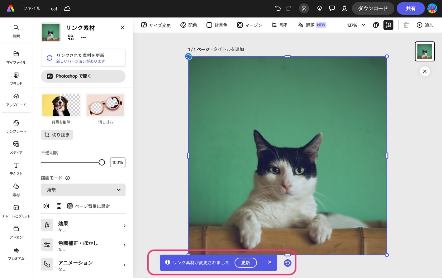 試しにこちらのアセット画像をPhotoshopで背景色を変更してみました。AdobeExpress画面に戻ると更新というボタンが現れます。