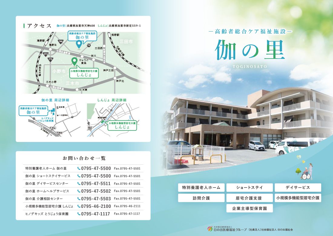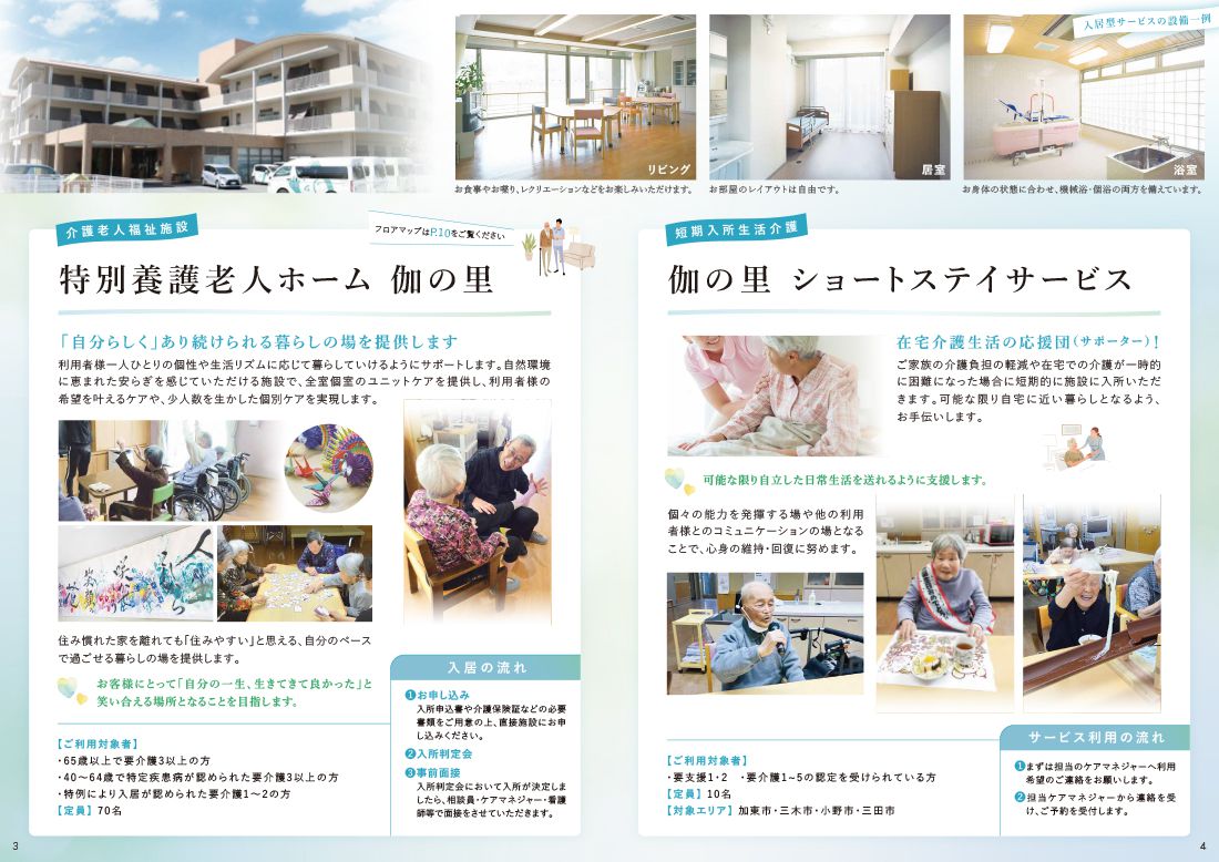 入居、通い、訪問等多機能のサービスを併せ持つ「高齢者総合ケア福祉施設 伽の里」のパンフレットをデザインしました。