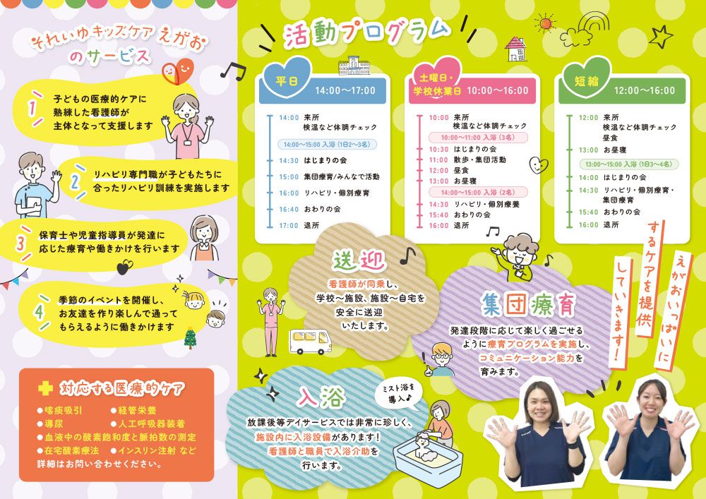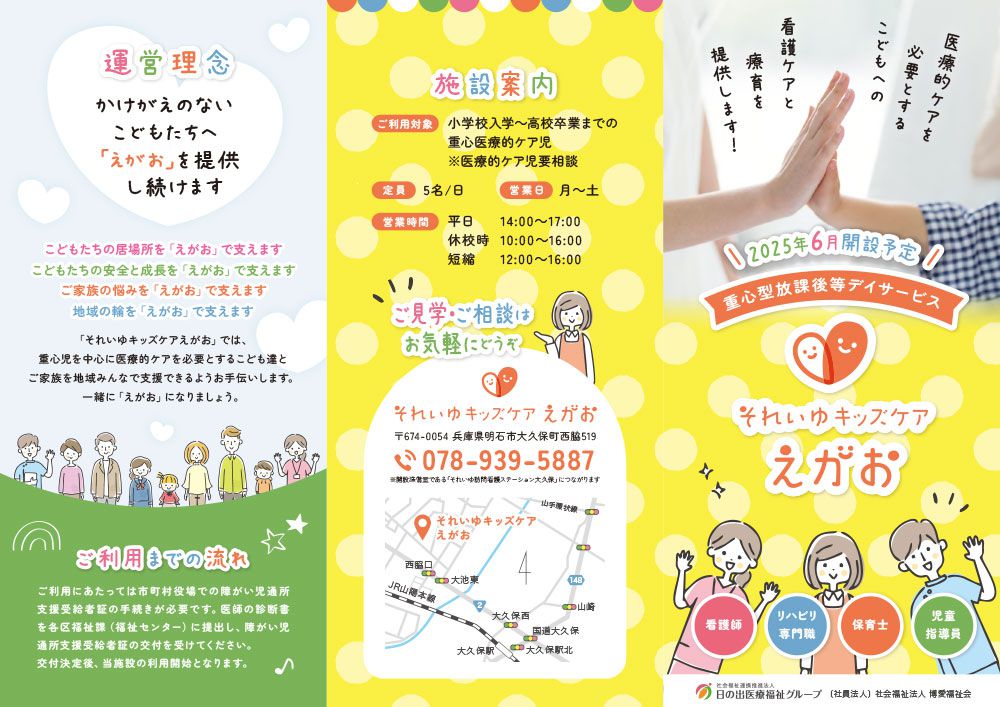 重心型放課後等デイサービスで過ごせる一日の流れやコンセプト、取り組み、サービスの特徴を明るく楽しく伝わるようにこころがけたデザインです。