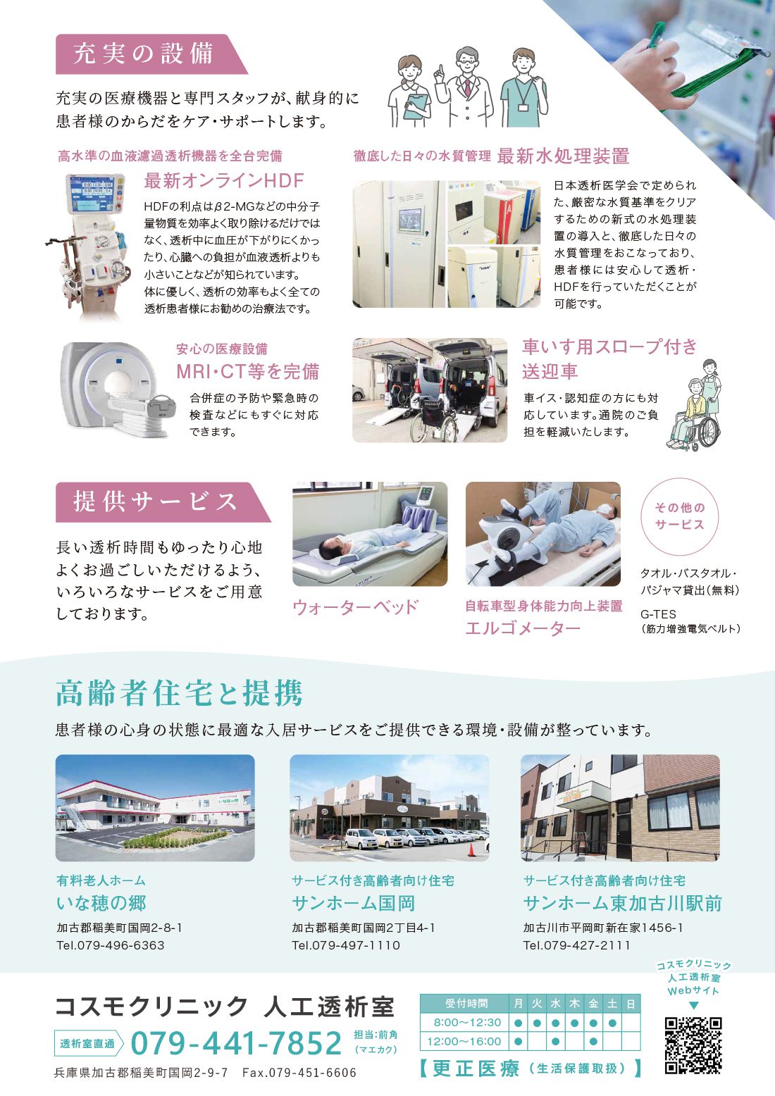 透析の医師・専任スタッフのアピールを強くし、清潔感のあるミントグリーンとロゴのパープルで配色しました。